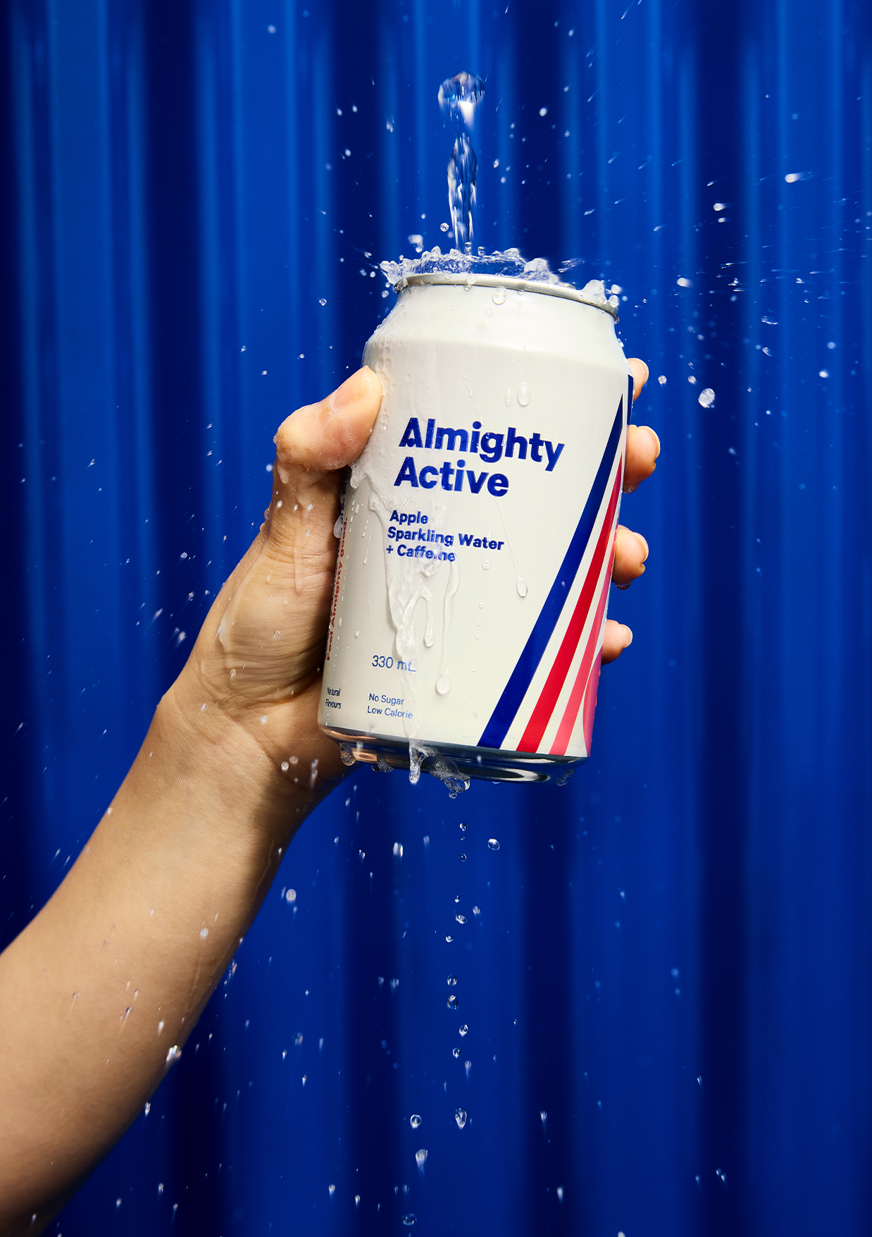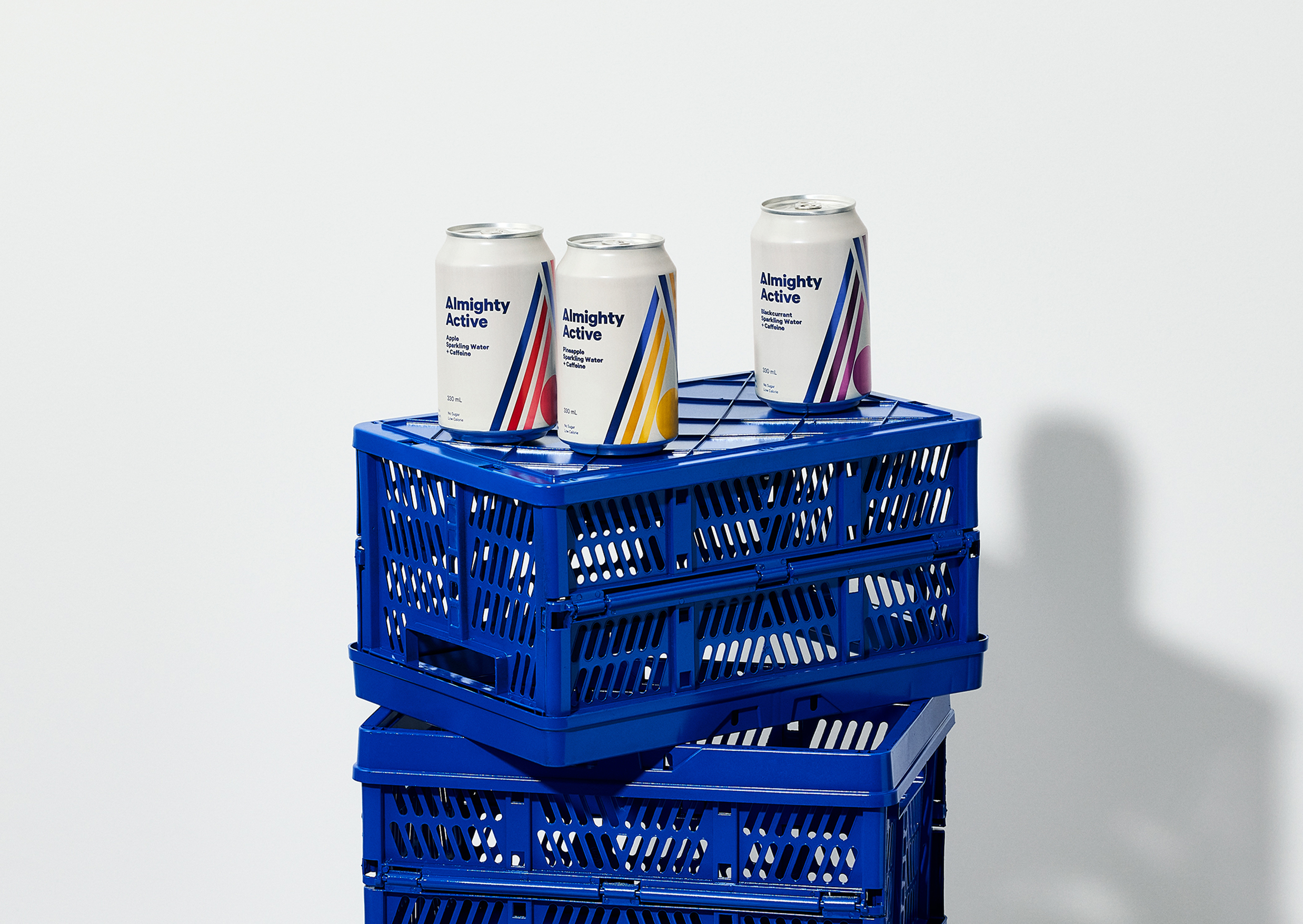 After the success of Almighty’s juices and sparkling waters, we were tasked with designing packaging for the new Almighty Active range, to sit in the over-saturated and somewhat garish ‘energy drinks’ category. This is a clean offering – no sugar, naturally flavoured charcoal filtered sparkling water with 80mg of caffeine added. Unlike standard sports drinks Almighty Active is actually good for you! We saw this as an opportunity to break the norms of this category while remaining recognisably ‘sporty’.