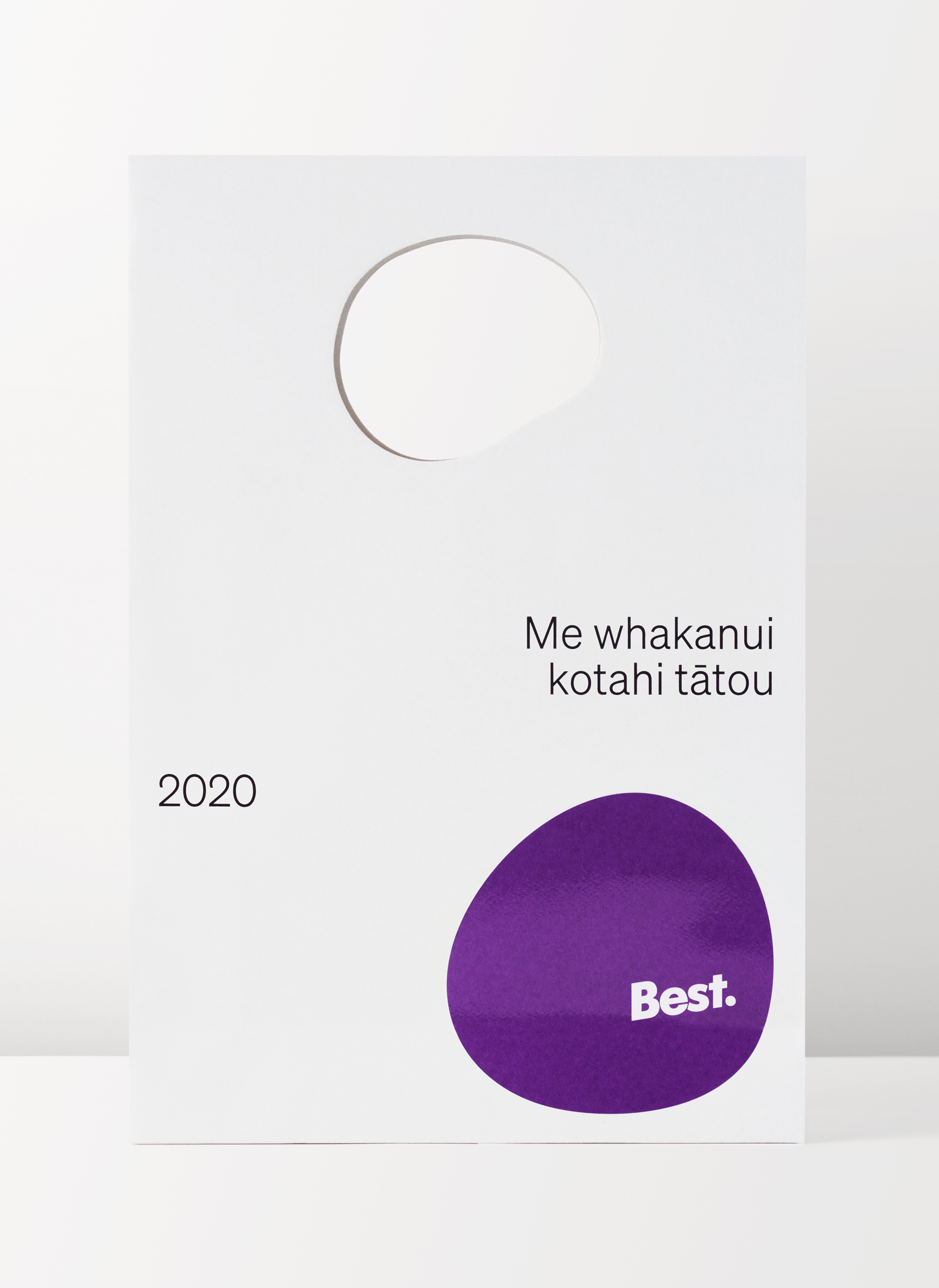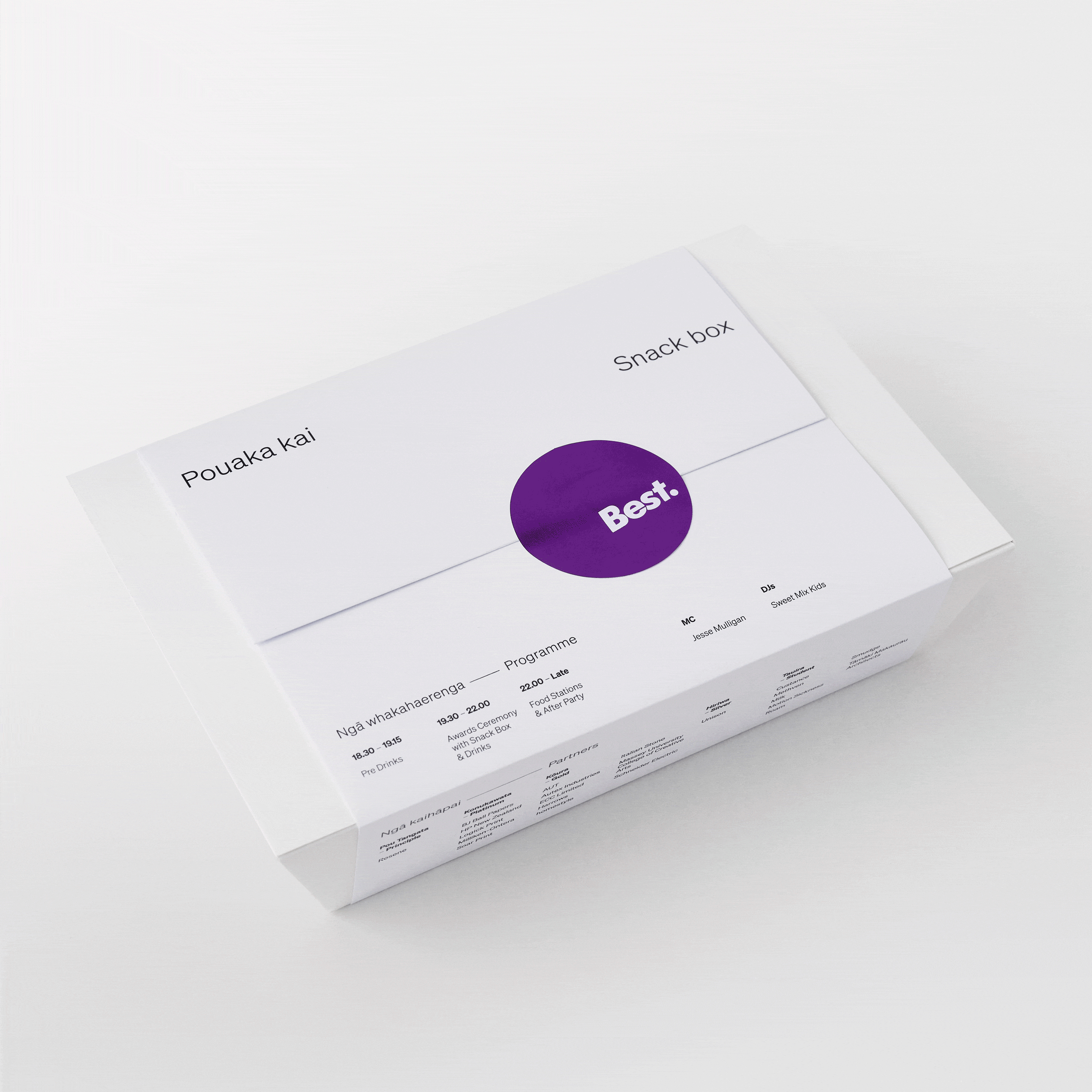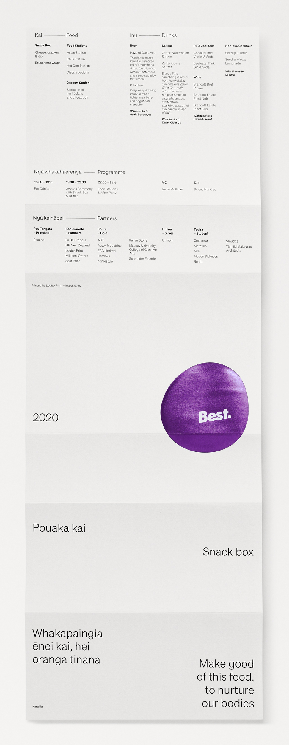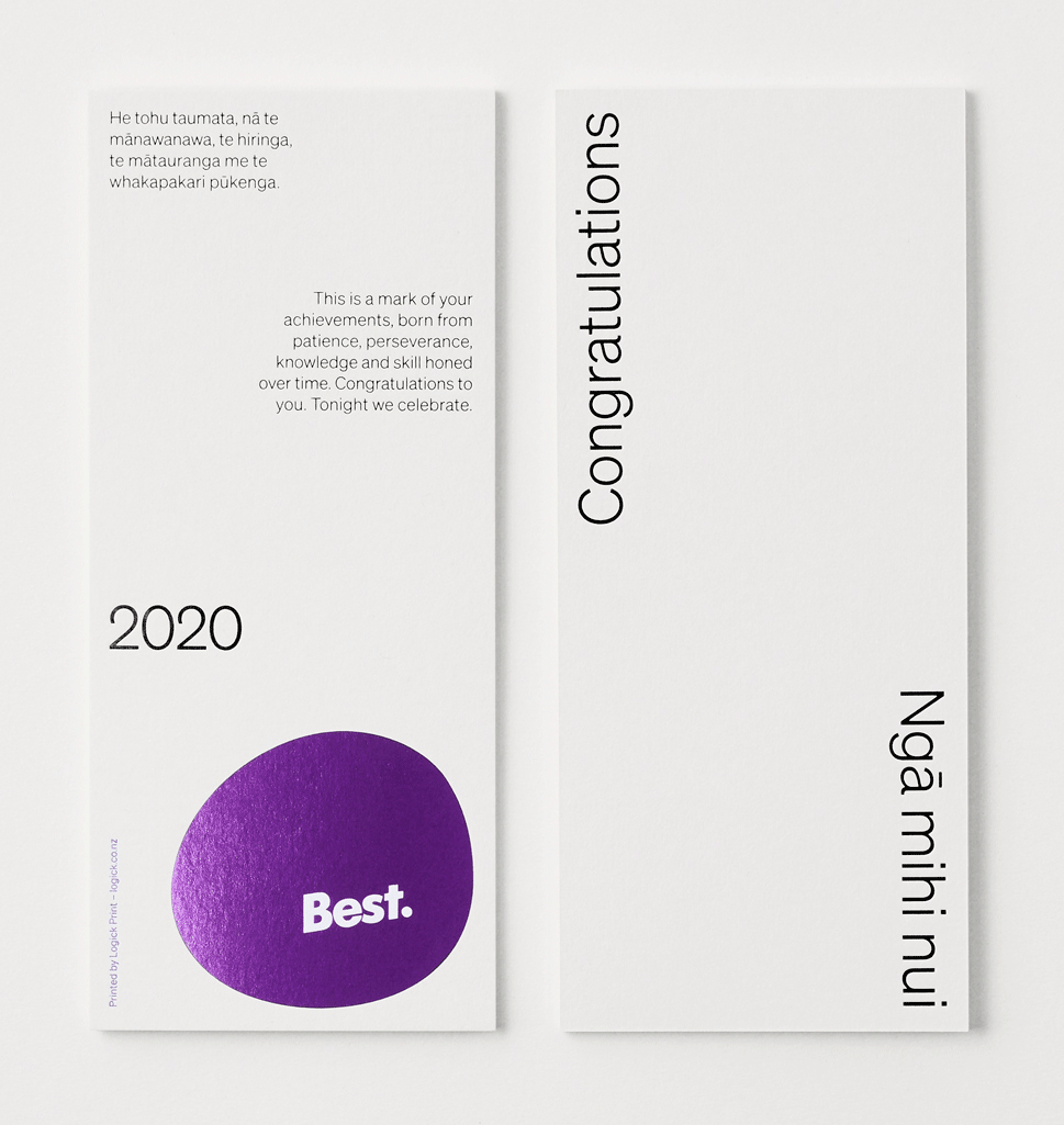 Another key factor was that 2020 would be the first fully bilingual Best awards, in partnership with Te Taura Whiri i te Reo Māori, so incorporating Te Reo Māori into the work was hugely important. All text was presented in both Te Reo Māori and English to connect design with the unique identity of Aotearoa. We also saw the awards as an opportunity to put aside the turbulence of 2020 and live in the moment, summed up by the line “Me whakanui kotahi tatou” (tonight we celebrate). Did we celebrate? Oh āe we did...