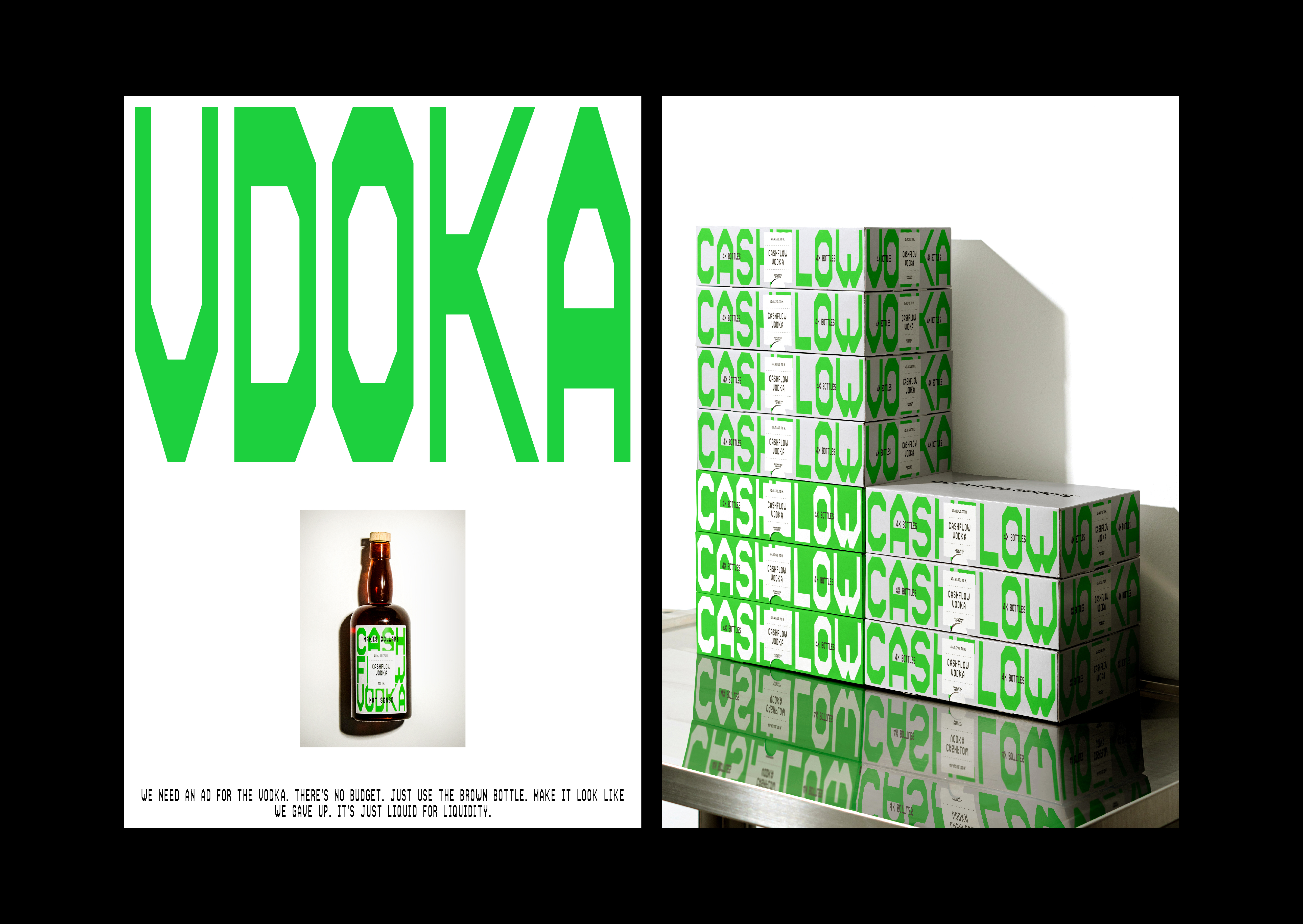 There was no time. It needed to be designed yesterday. The off-the-shelf brown bottle, intentionally wrong for vodka, became the perfect middle finger to the category’s sterile, frosted-glass sameness. The label featured brutalist type, inspired by a receipt. Deadpan copy. A name that says it all without trying. No gold foil. No fake heritage. Just a design that wears its honesty like a badge.