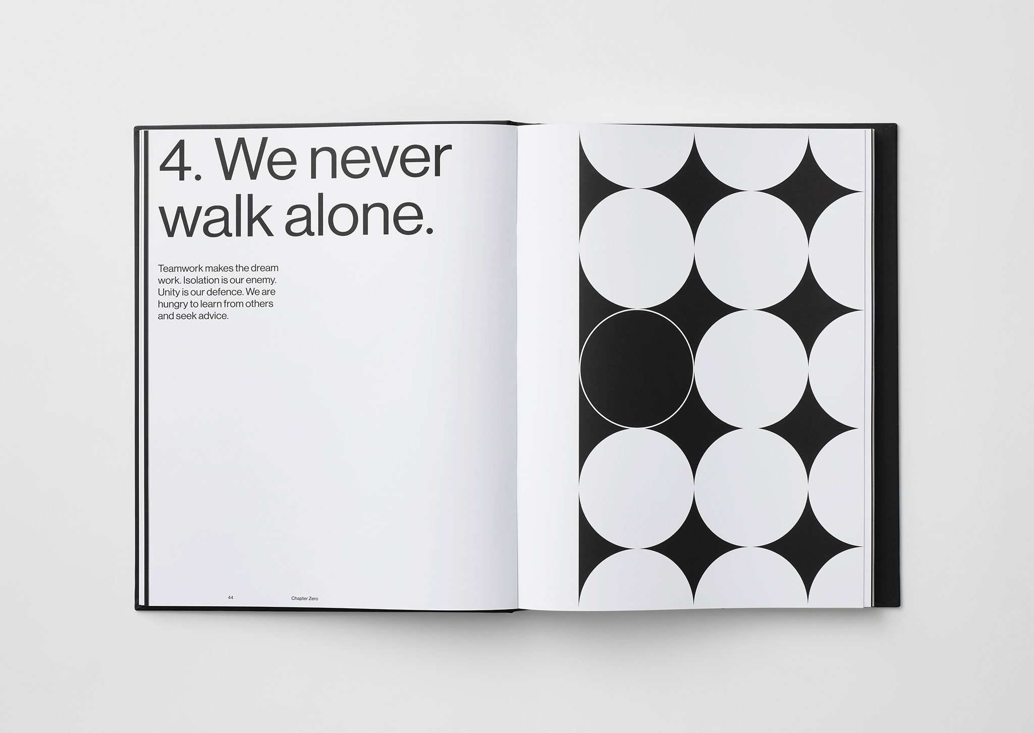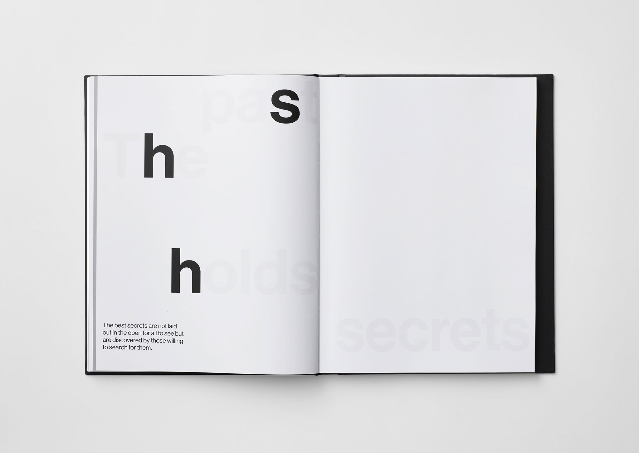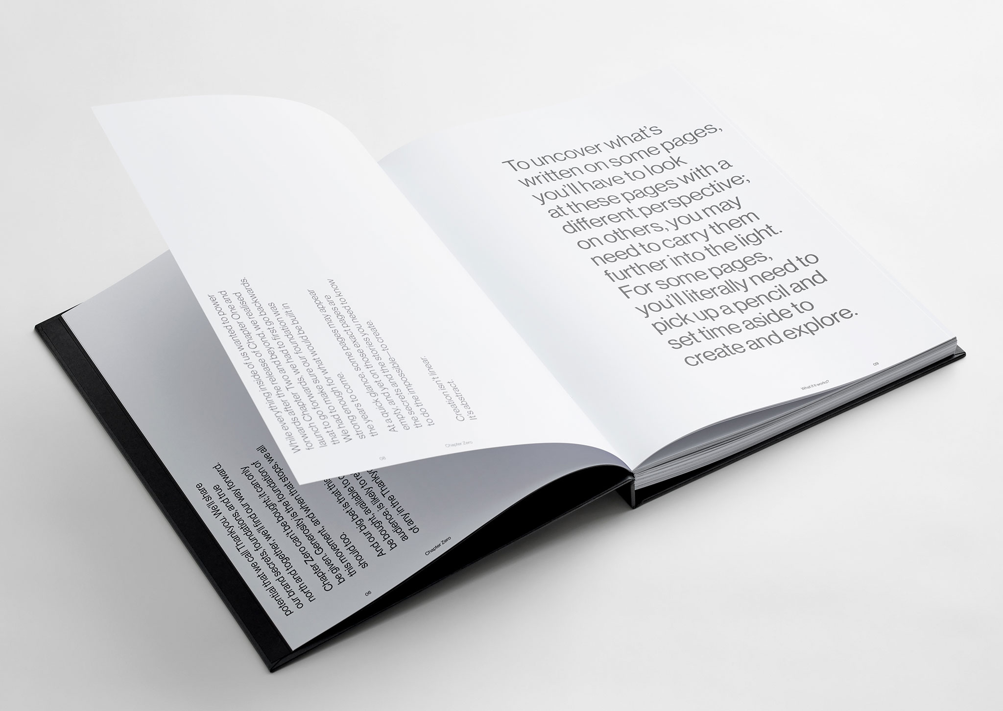 Chapter Zero was designed to be timeless and understated, bringing ideas to the forefront. We designed it so that if someone was to pull it from the bookshelf in 10 years’ time it would still be as relevant as the day it was created. The uniform use of one typeface (Neue Haas Grotesk), the black and white photography, the size and weight and the hidden print finishes - all make you take notice. There are 200 handcrafted books, each taking 2 hours and 45 minutes to physically construct. This book demands attention.