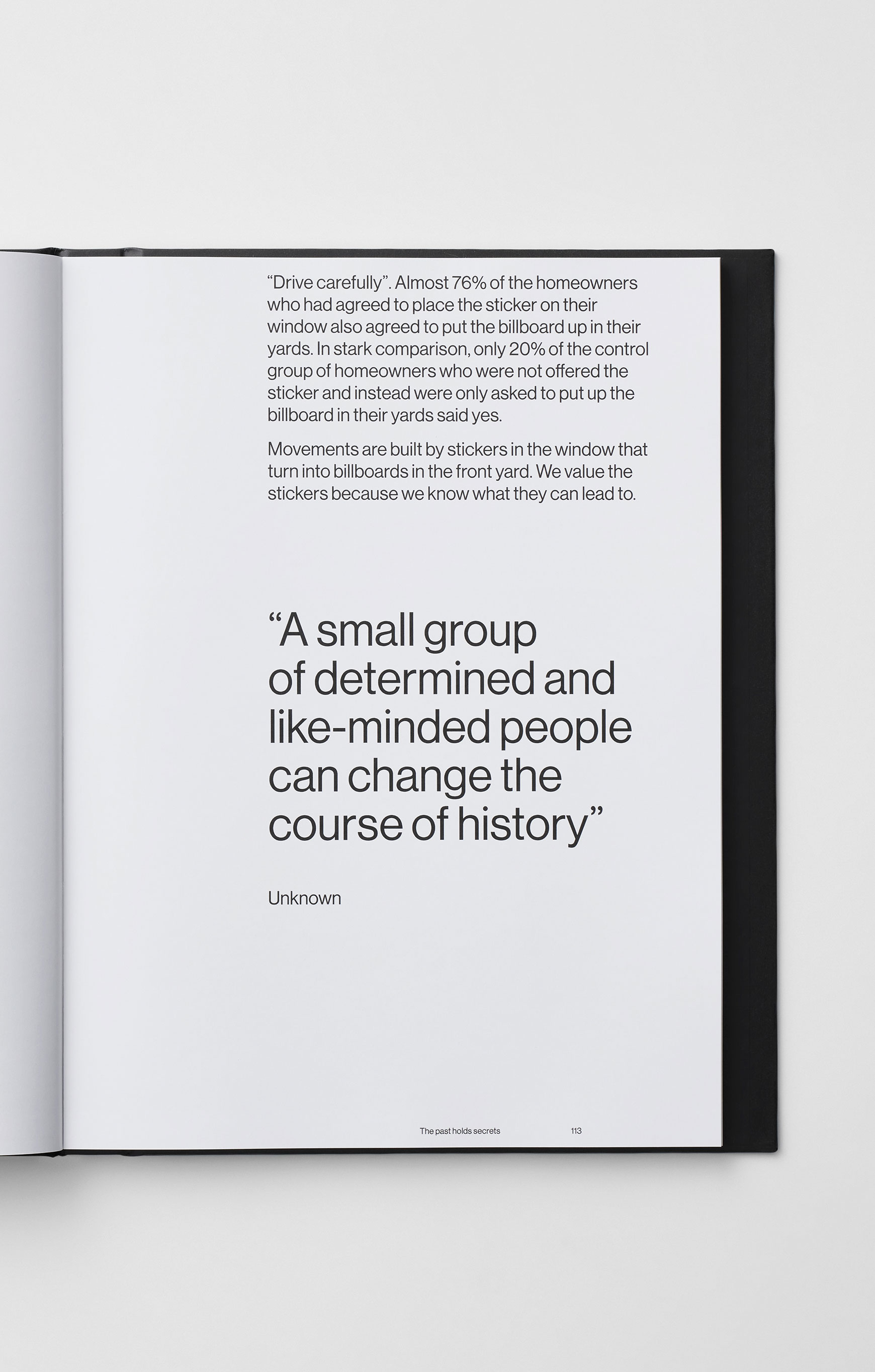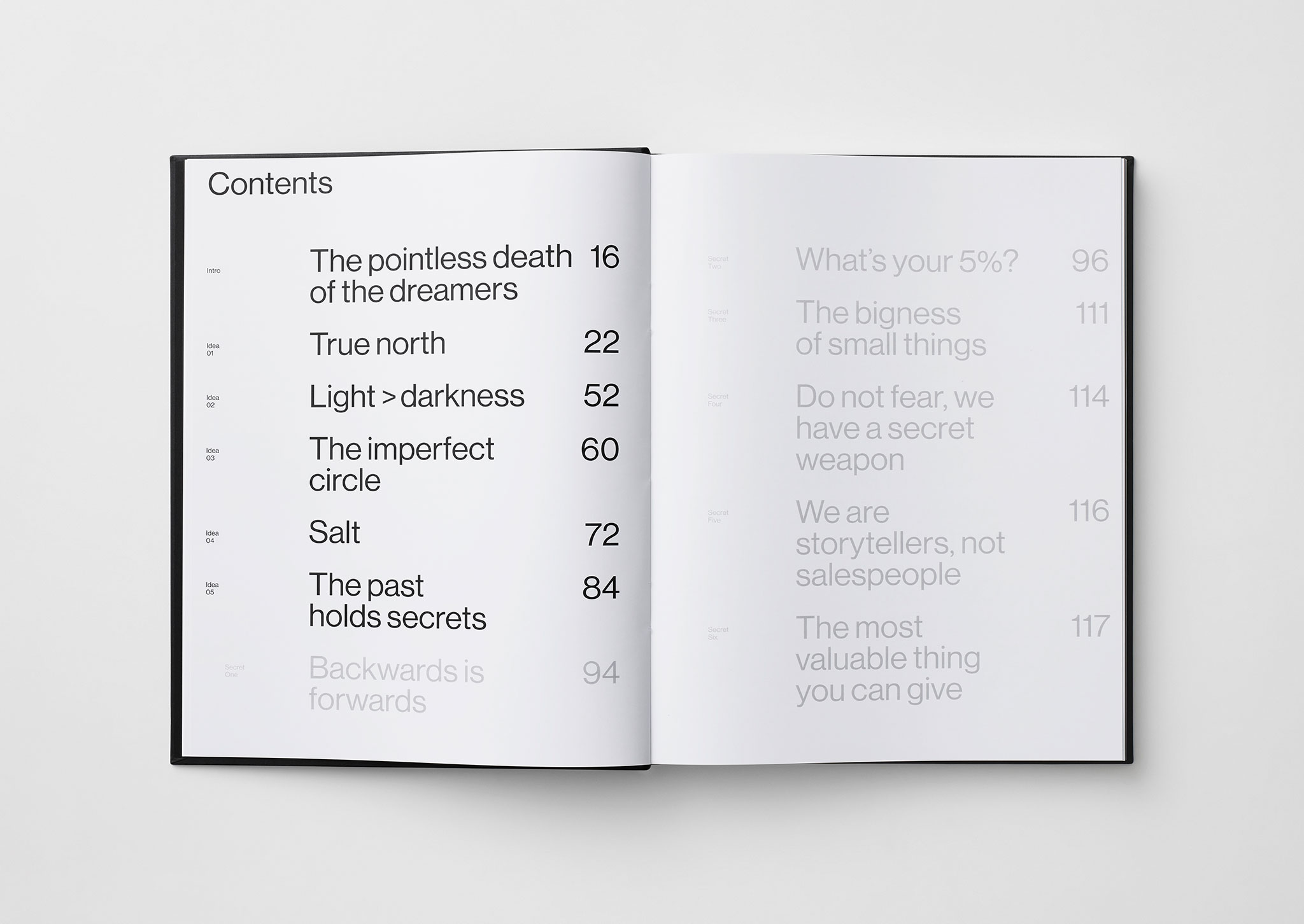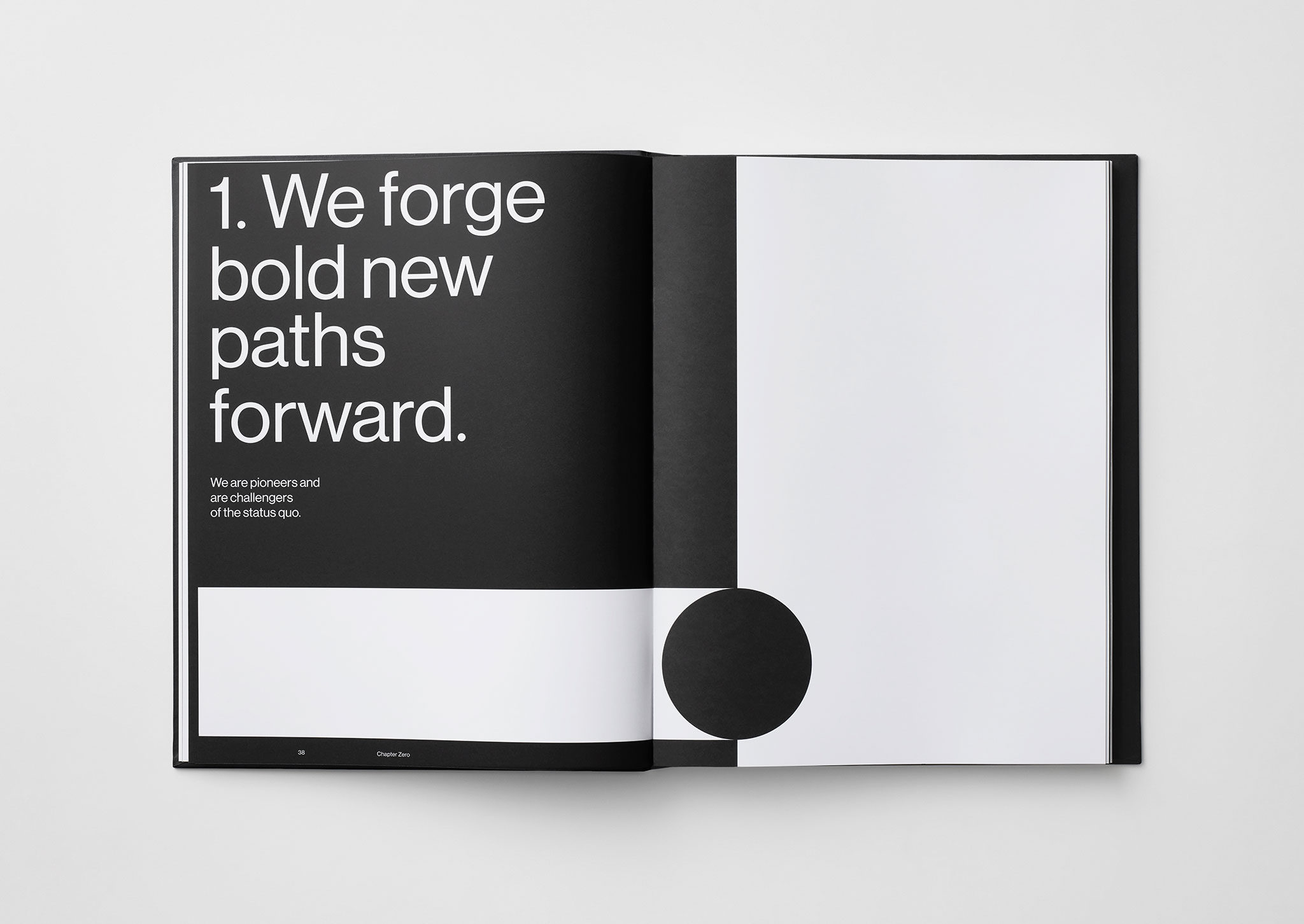 Chapter Zero was designed to be timeless and understated, bringing ideas to the forefront. We designed it so that if someone was to pull it from the bookshelf in 10 years’ time it would still be as relevant as the day it was created. The uniform use of one typeface (Neue Haas Grotesk), the black and white photography, the size and weight and the hidden print finishes - all make you take notice. There are 200 handcrafted books, each taking 2 hours and 45 minutes to physically construct. This book demands attention.
