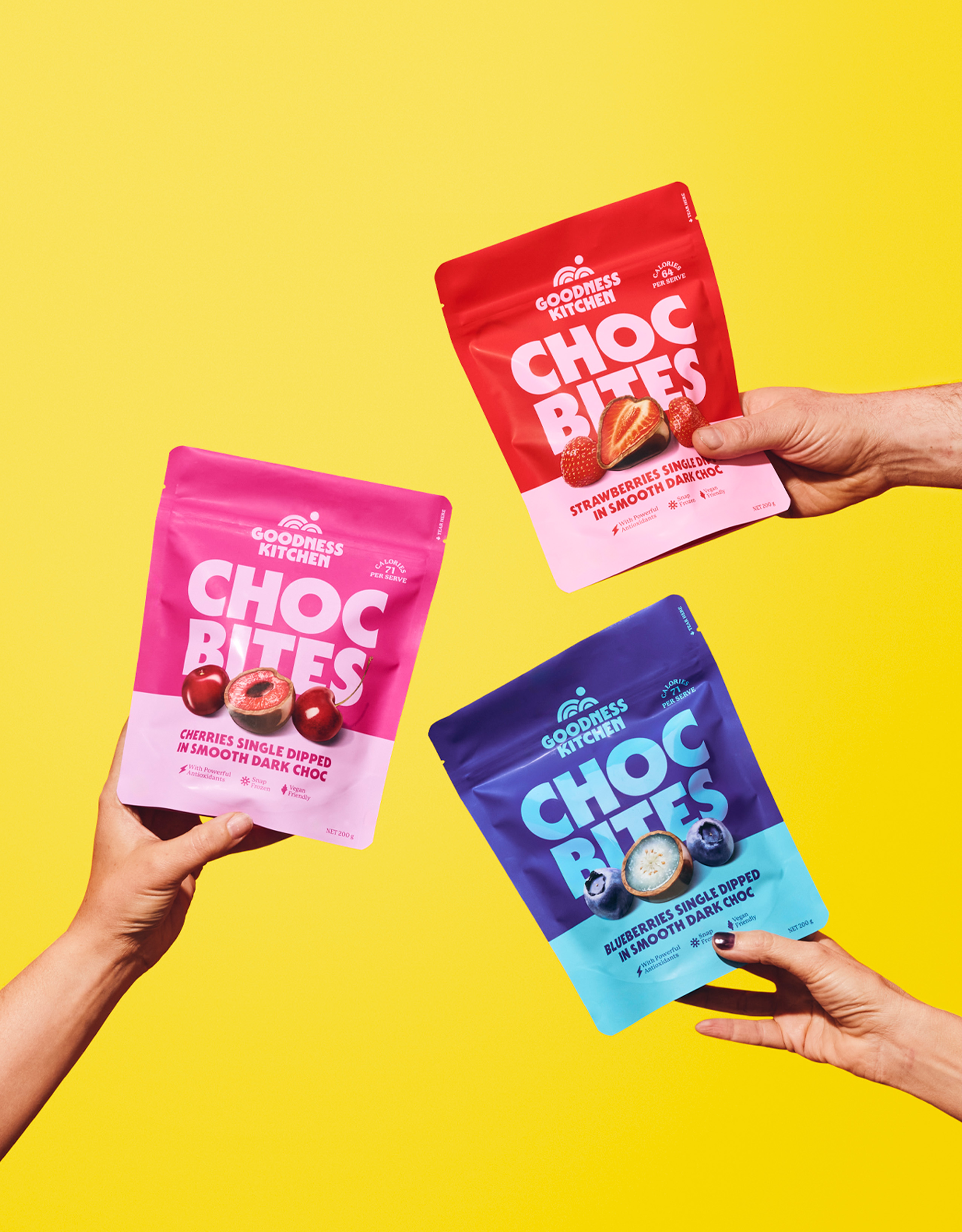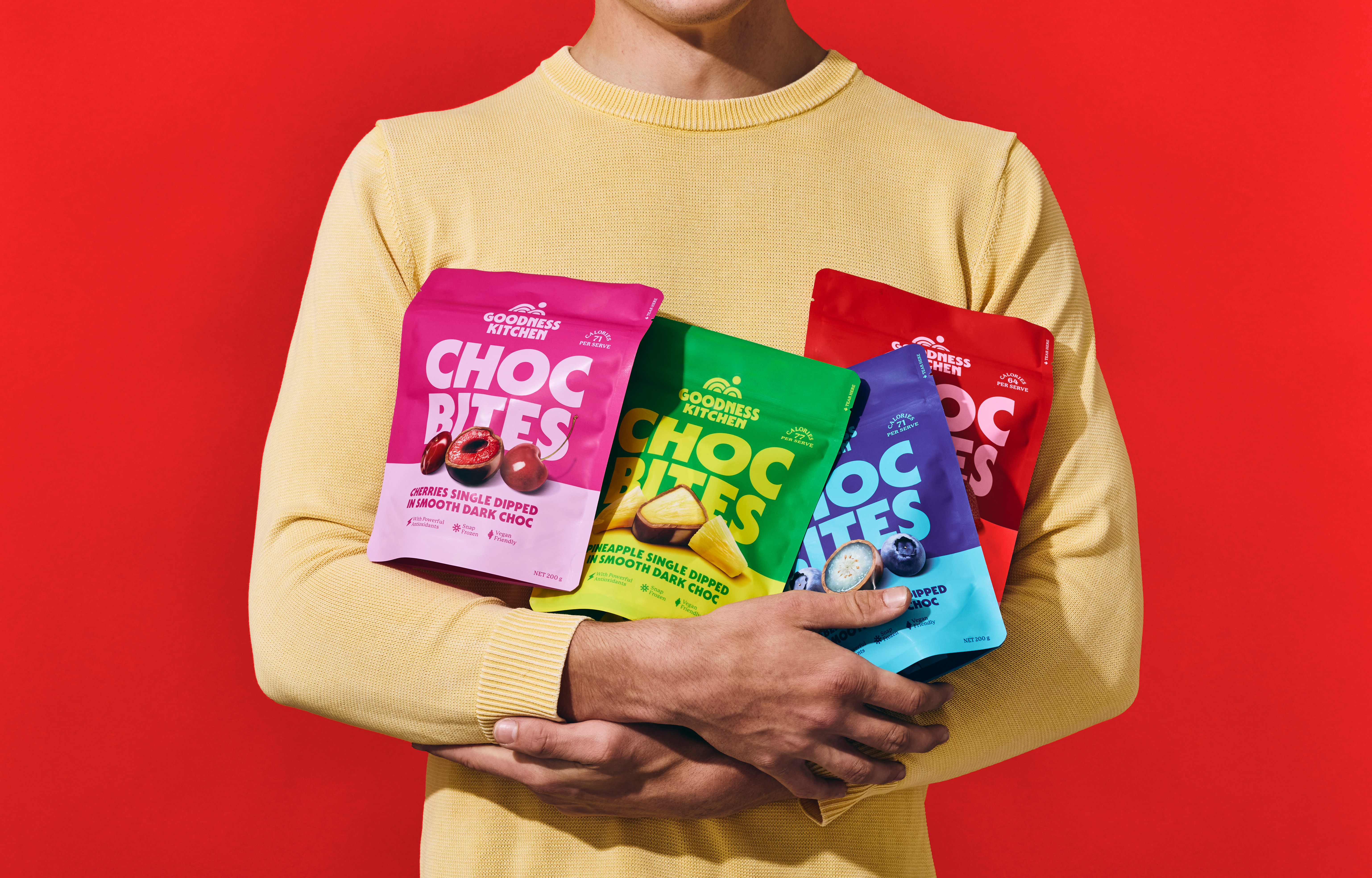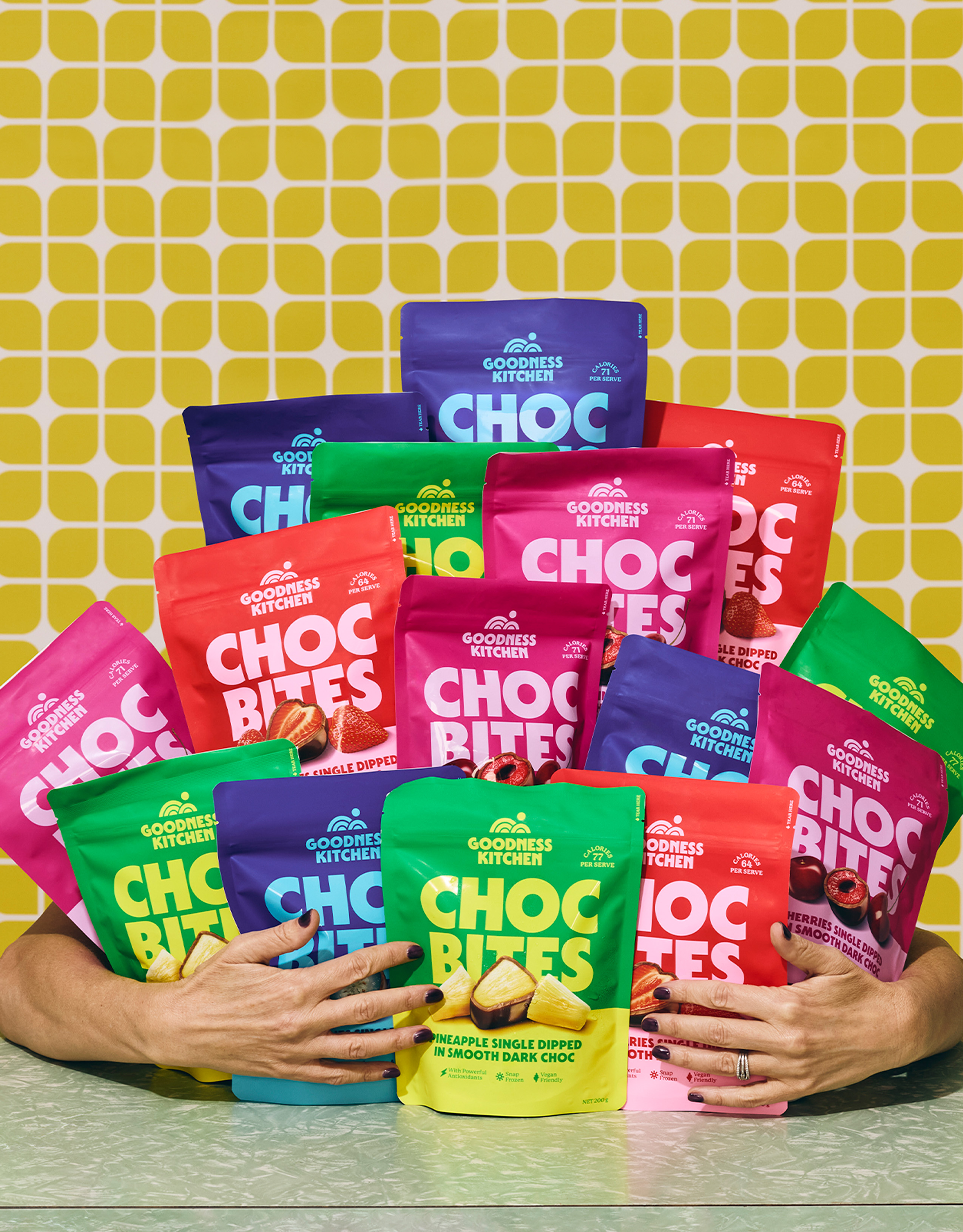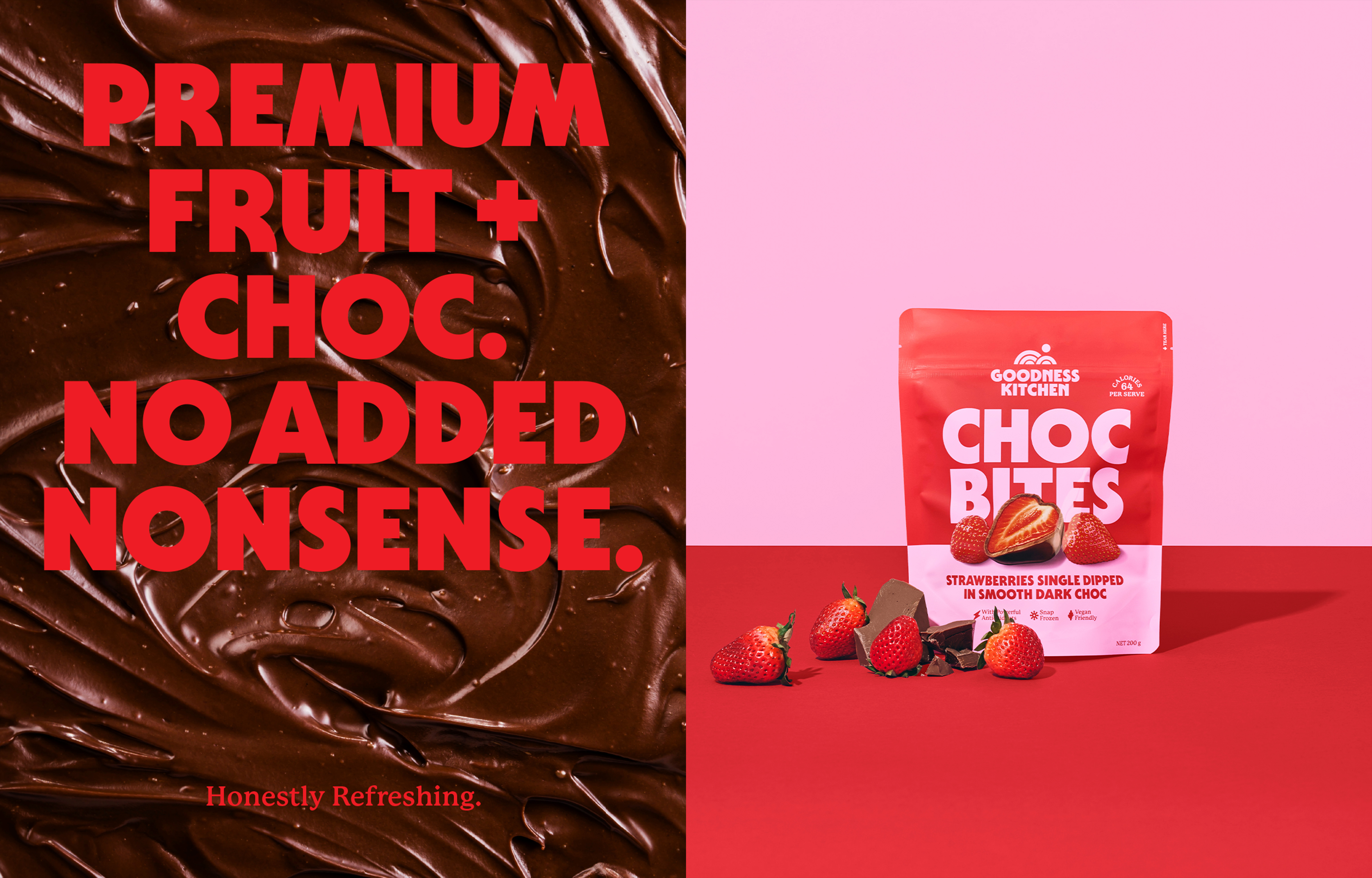 Goodness Kitchen, known for its commitment to wholesome snacking, ventured into a new category with Choc Bites, a frozen dessert offering that's bright, fun, and just a little cheeky. A perfect balance of indulgence and goodness, these chocolate-dipped delights provide a natural sweetness with a satisfying crunch, making them a better-for-you treat that everyone can enjoy.