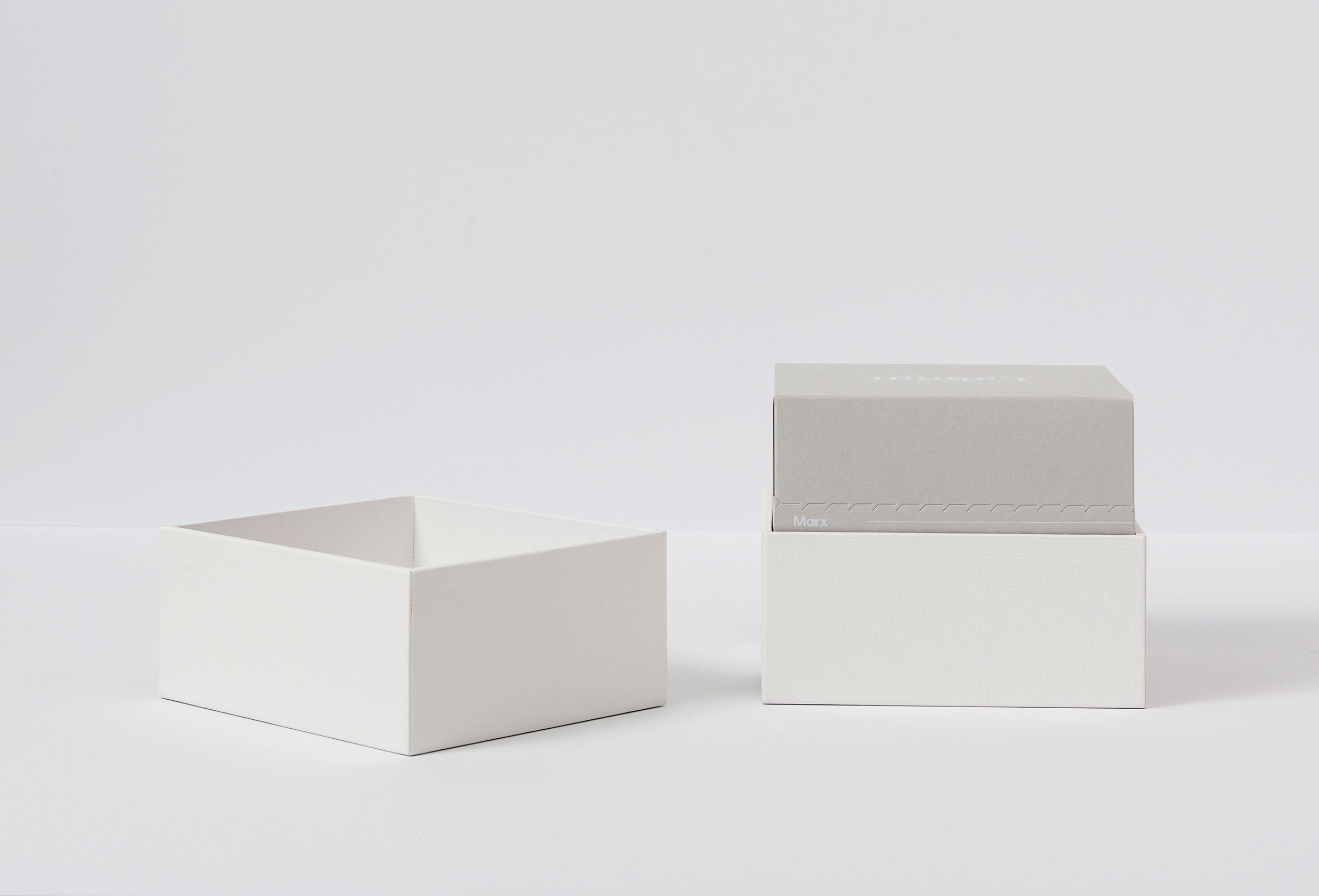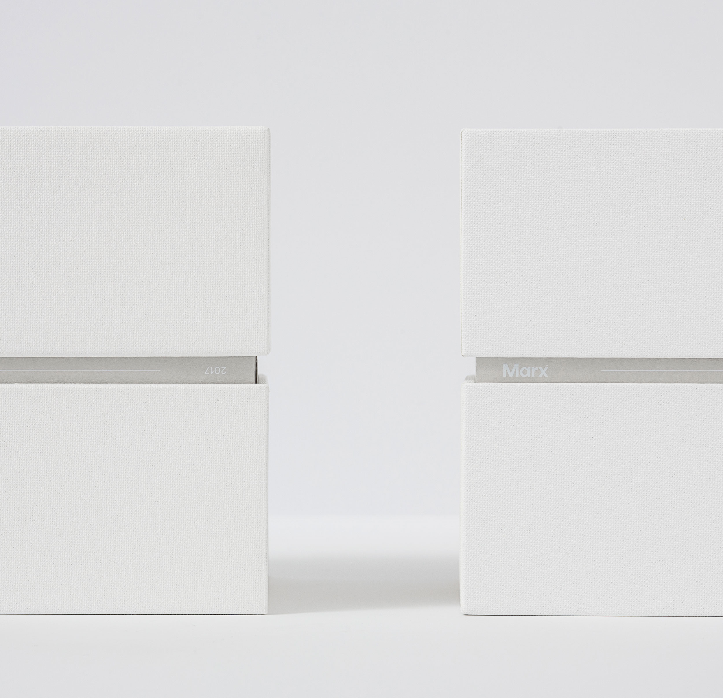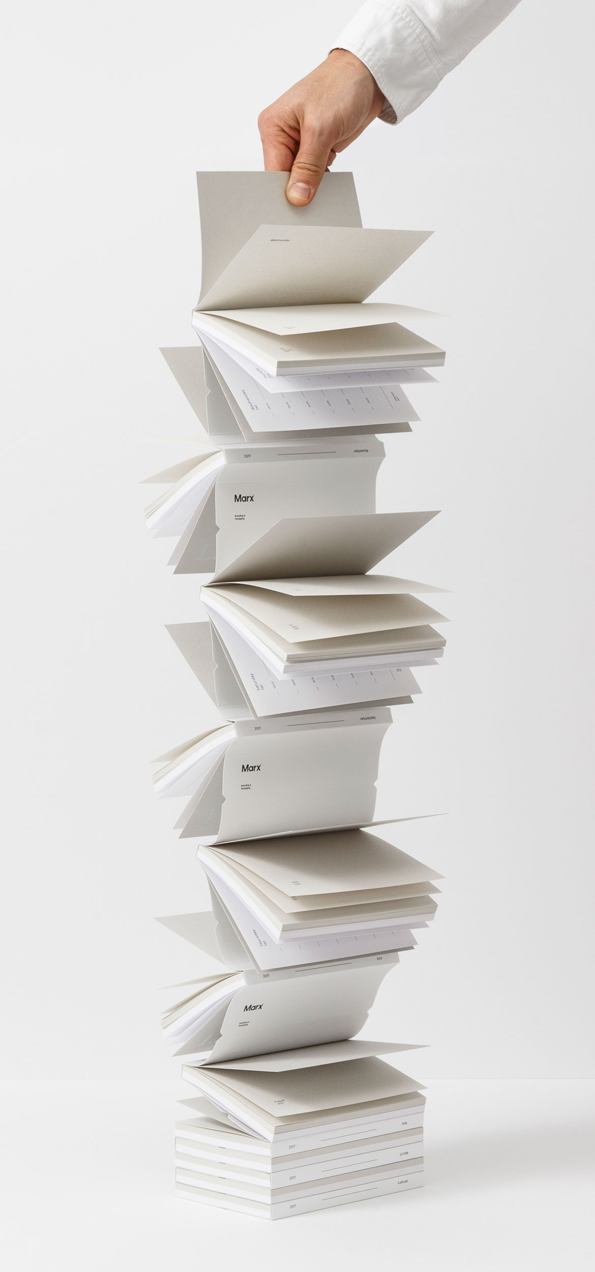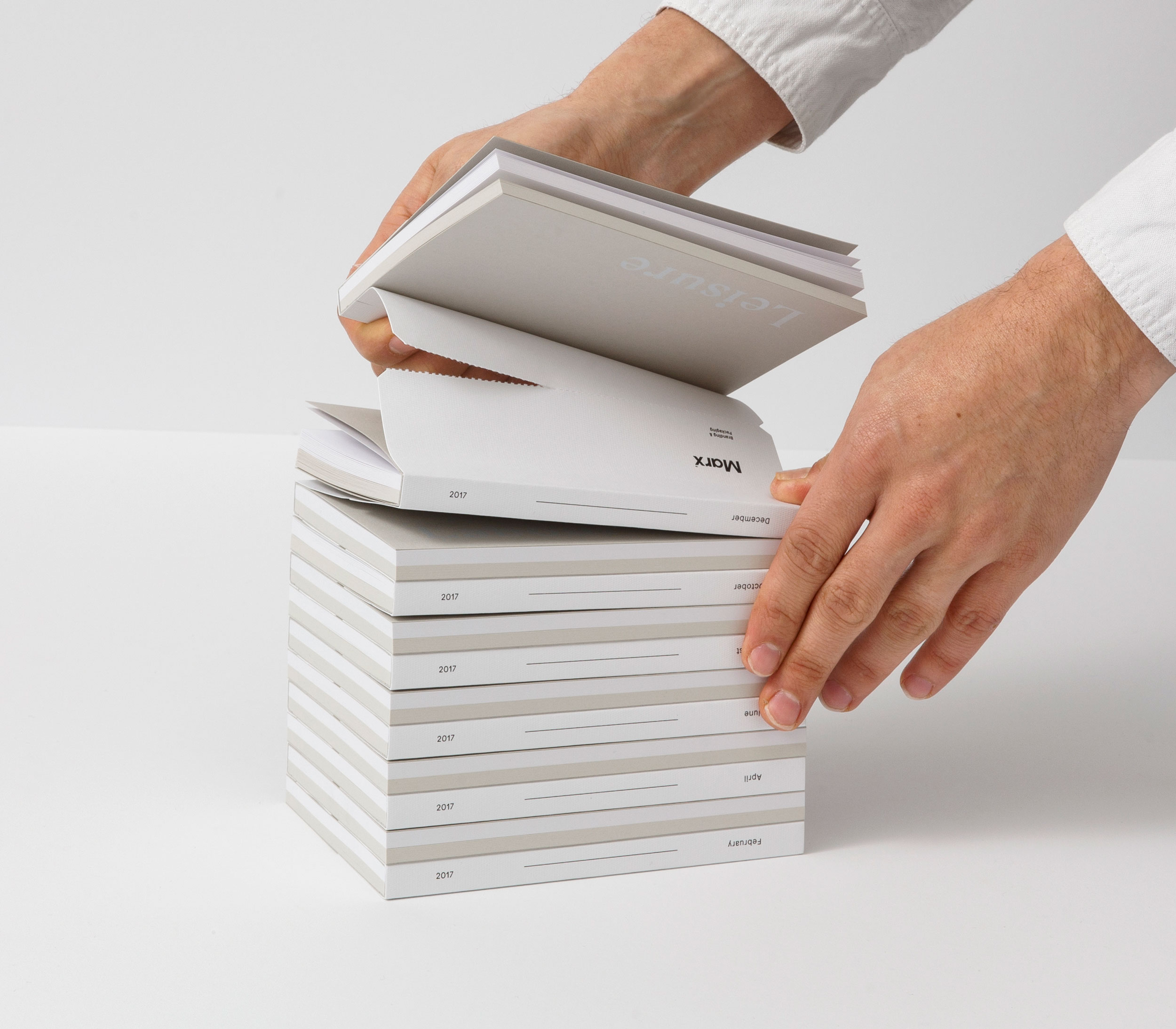 The gift was centred around 12 individual planners which stack back to back, attached by a central spine which allows each one to break away as they are used up. The brick-like stack was tucked into a cardboard sleeve with tear-tabs for opening, contained in two cloth bound book trays.