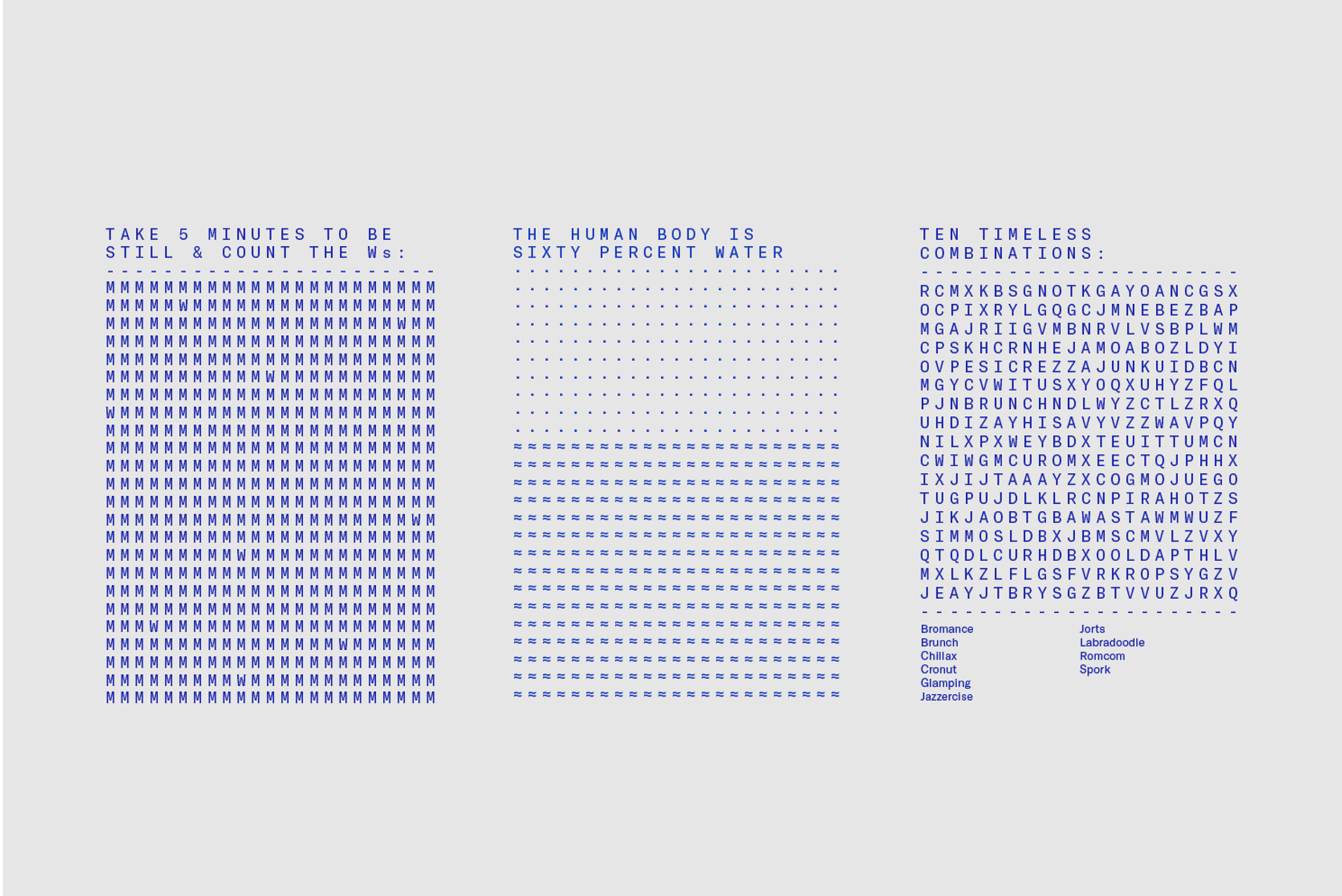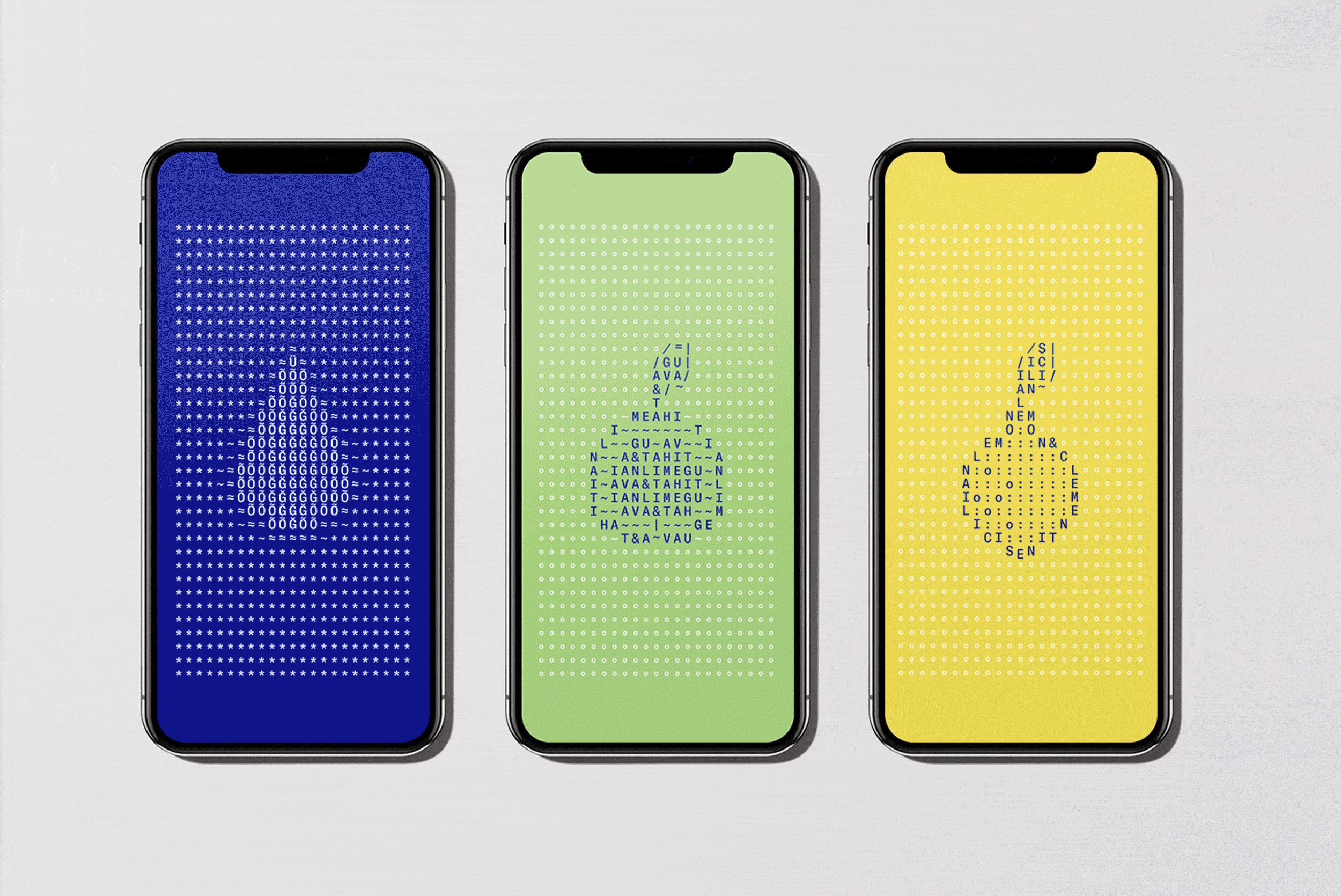 The imagery for the three products is made by multiple individual text characters forming a cohesive whole. An image of a pear, apple and drop of water emerge from the code, a homage to how coding creates imagery in computer graphics. This offers the potential for hidden messages using the text characters. We had found a way to communicate a lot within a very minimal framework.