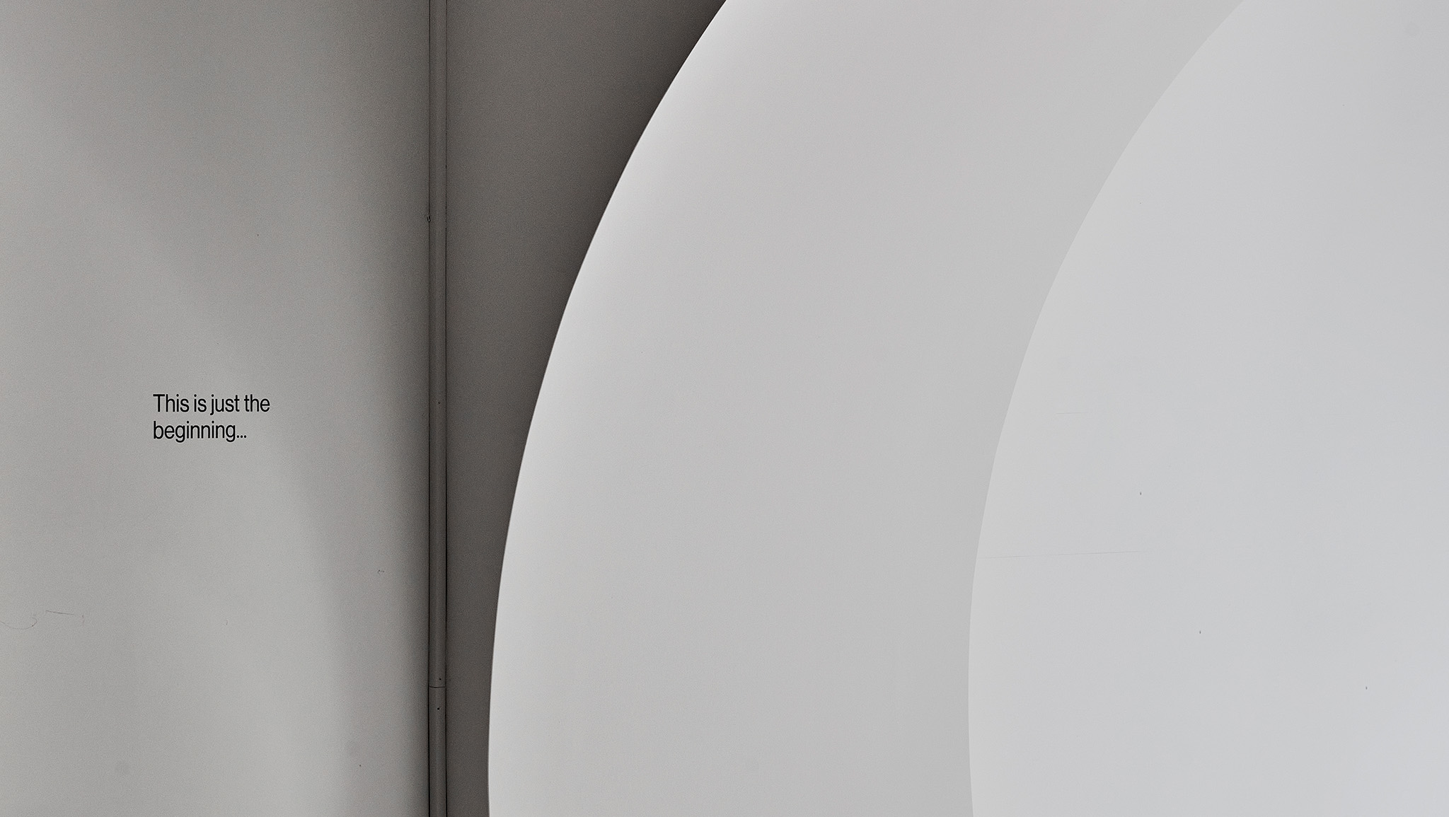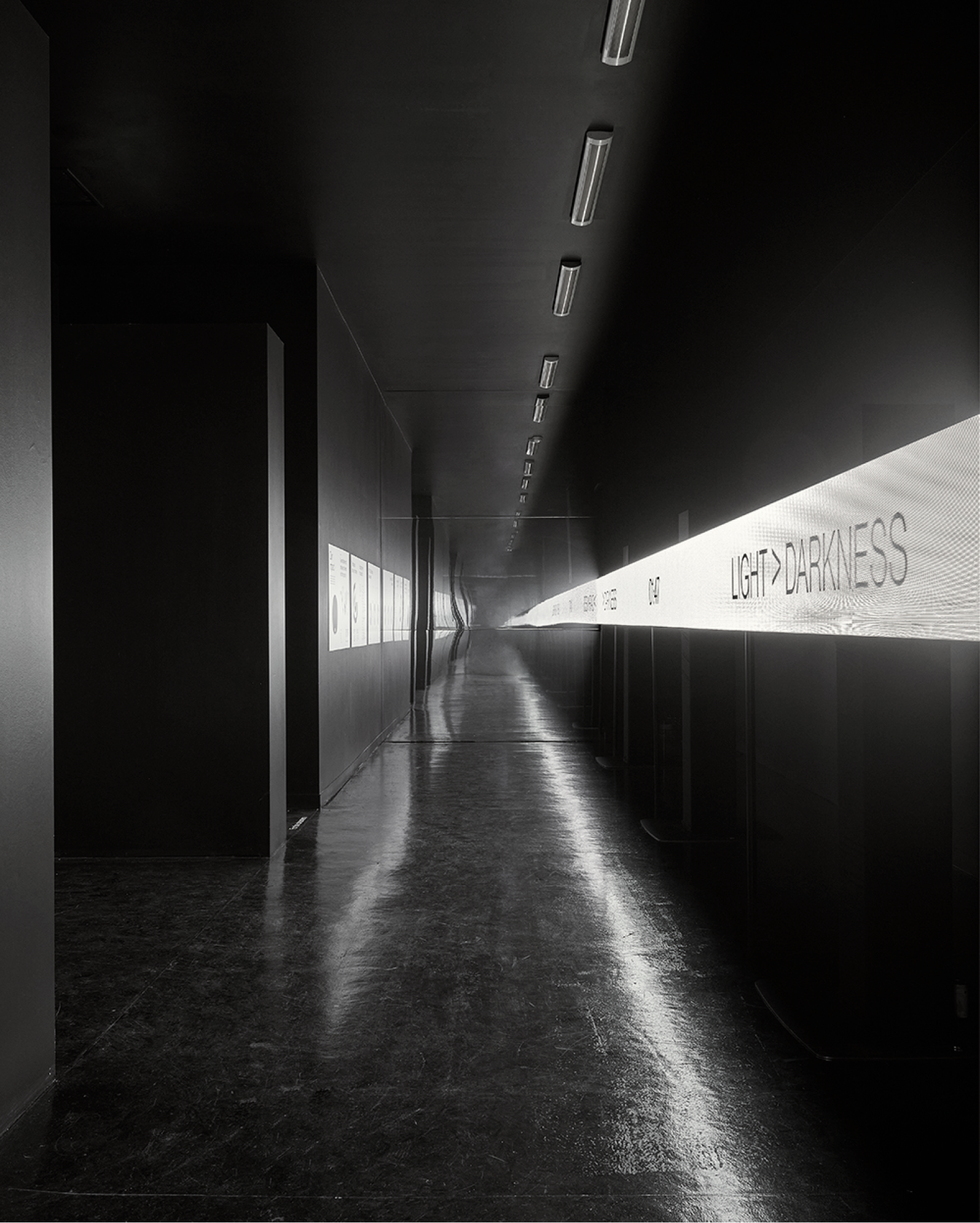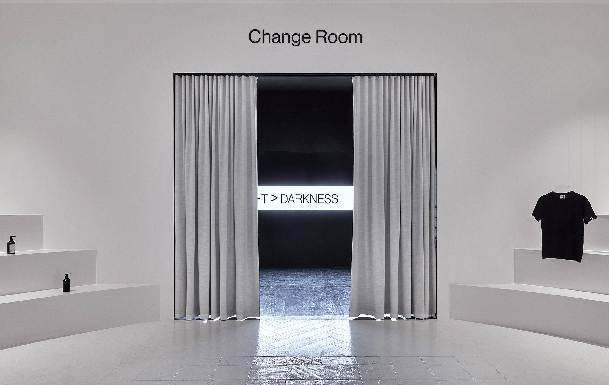 At the rear portion of the main space is the “Change Room”, which polarises the stark, crisp, white interior of the main space. The room is dark and futuristic, with a typographic and infographic display via a continuous LED screen mirrored on both ends of the blacked-out space. Secondary galleries occupy the side areas behind the amphitheatre that share the suspended panels, soft lighting and ambient soundscapes of the main space.