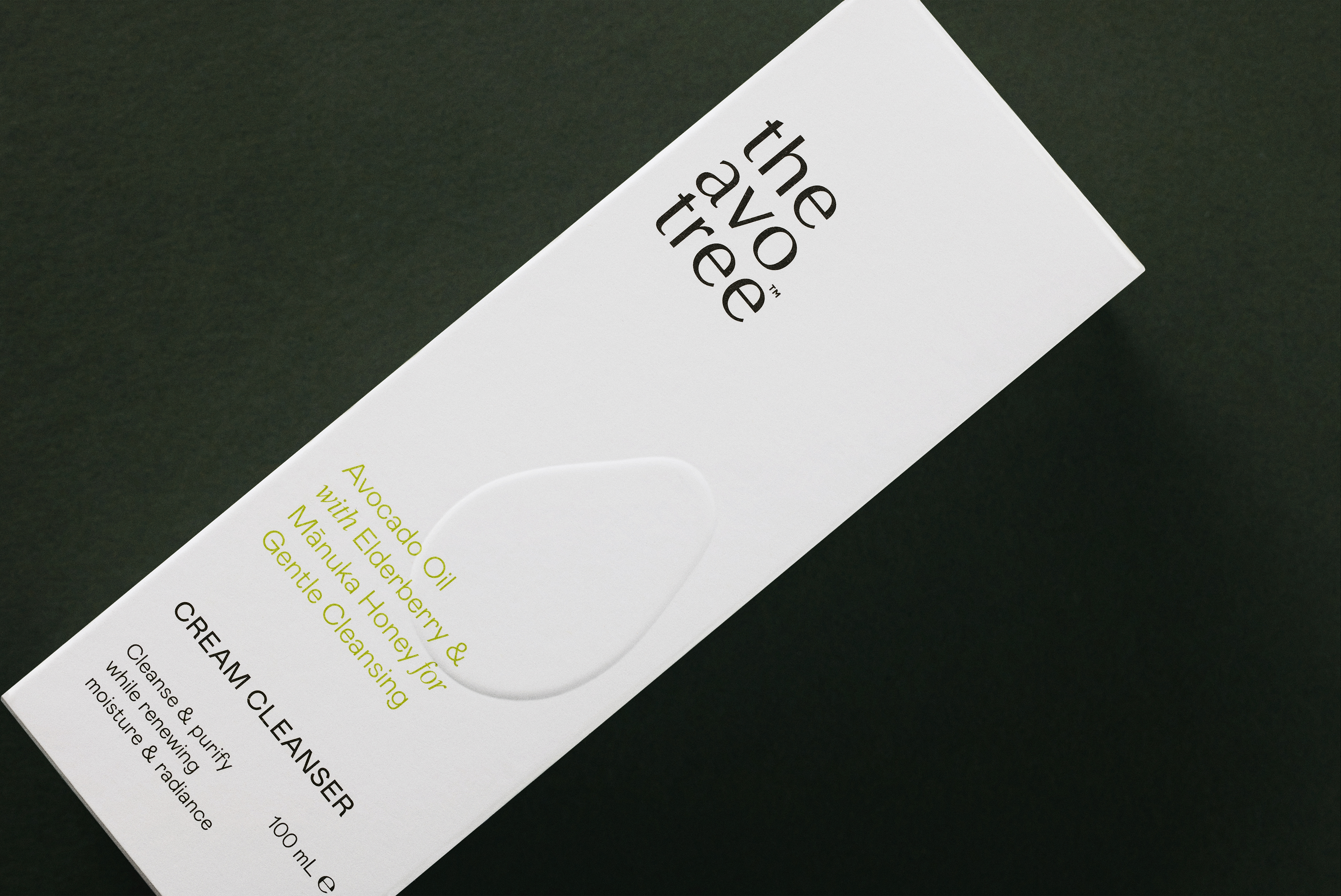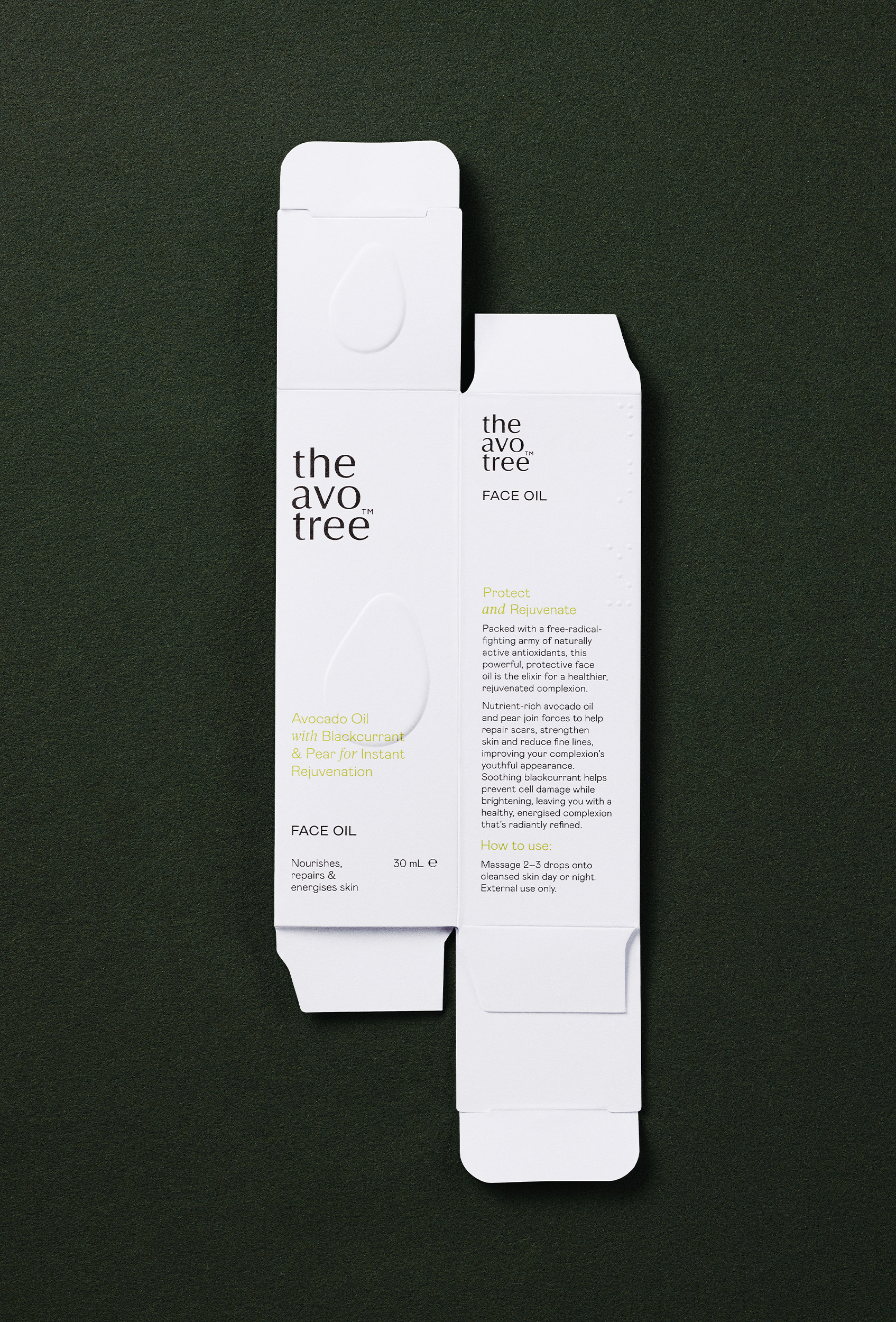 The simple silhouette of an avocado became the brand motif, used as a subtle accent across their skincare range. These are embossed on the uncoated outer boxes, the inner vessels have a tactile gloss finish contrasted against matte white.