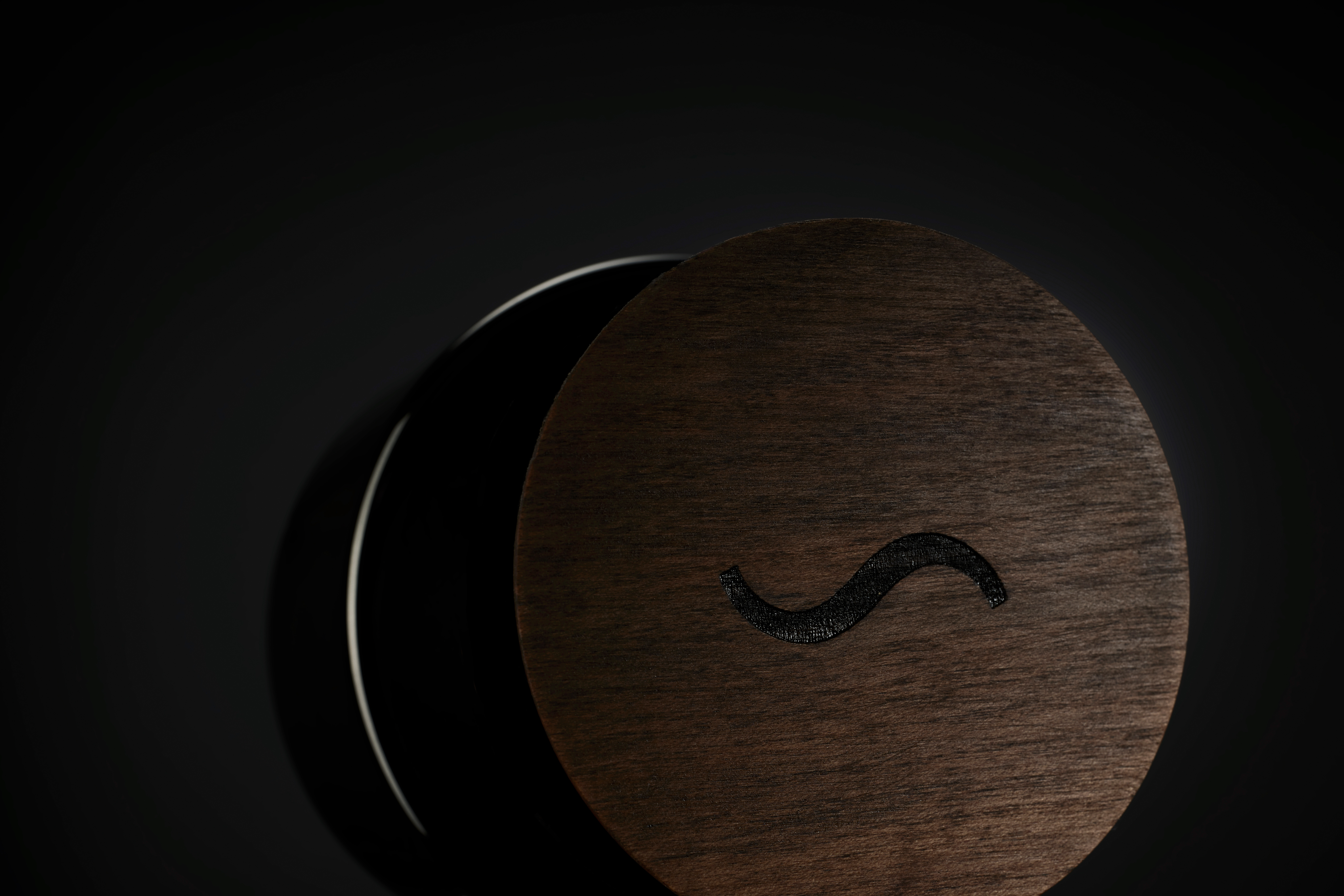 A bespoke barrel-like form with a reflective dark grey electroplated enamel finish and screen printing.