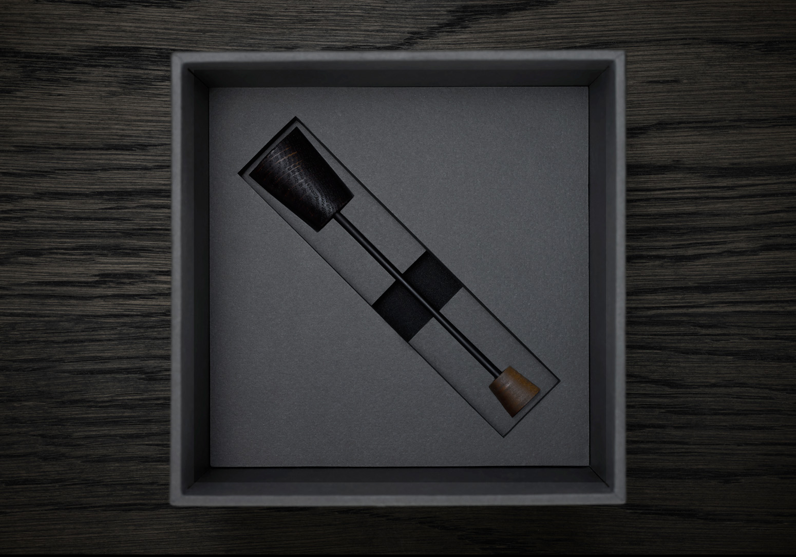 Made from matching woods, it fits neatly within the lid for functional elegance.
