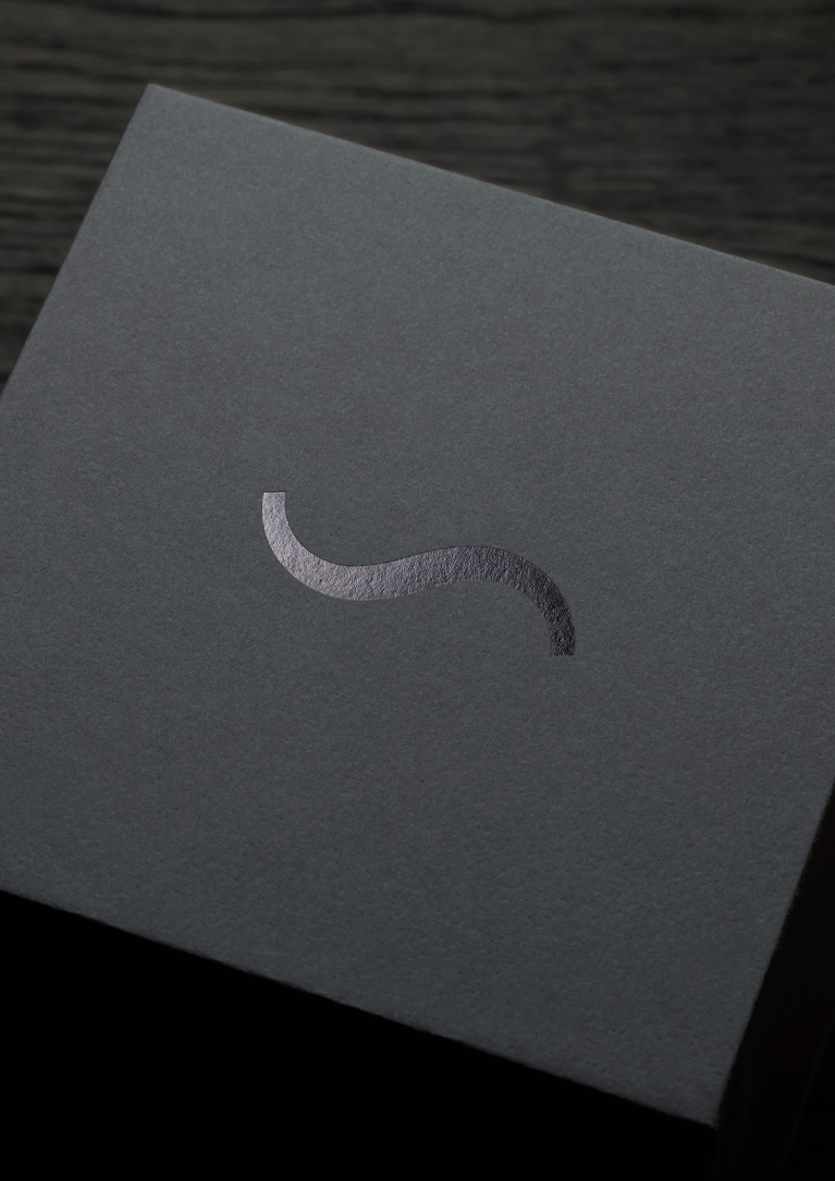 A handmade display box featuring uncoated textured grey paper, bookbinder's cloth, and black foil printing.