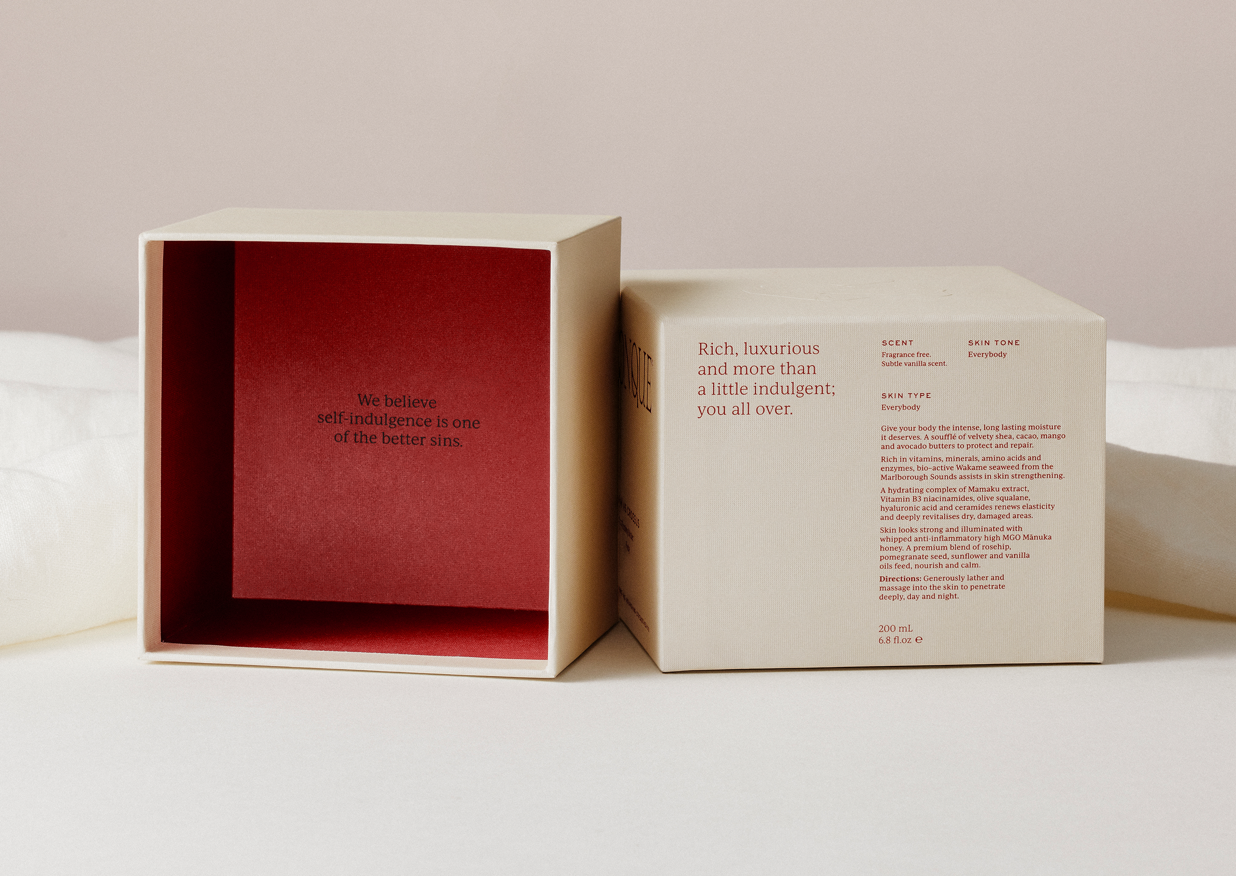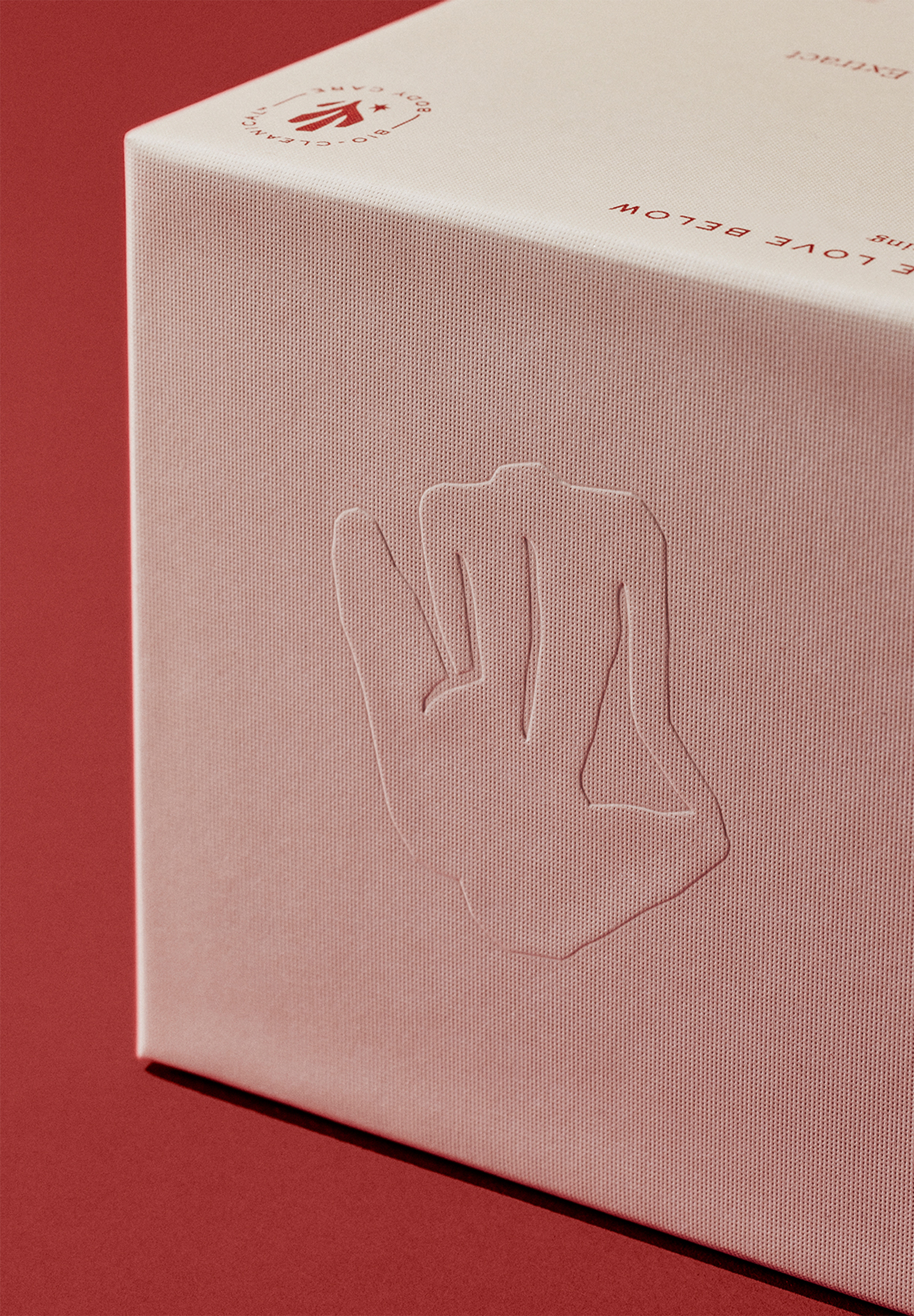 The sophisticated, visceral blood red was chosen for being ownable in the category and stands out in a sea of monochromatic brands. Language plays a key role in the design, with brand copy also placed inside the packaging to create an intimate unboxing experience.